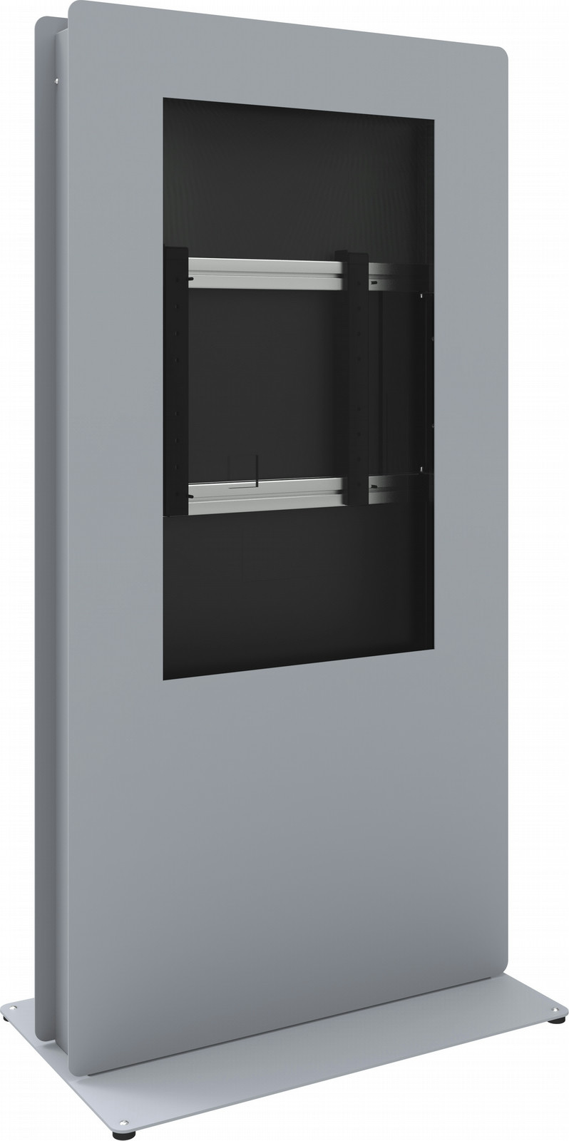 The flat screen totem is especially suitable for information purposes like in large shopping malls or at airports and train stations. We also experience the solutions being implemented in for example supermarkets, where Digital Signage solutions are used for commercial use and as mean to influence the purchasing behaviour of the consumer. Both the front- and back plate are removable for service or maintenance. The monitor is attached by means of an in height and dept adjustable interface. In the bottom of the totem we have reserved space for a PC of mediaplayer. The back side of the totem is fitted with ventilation holes, which are also suitable for adding blister hooks as point-of-sale. The SmartKiosk is available on request, at no extra charge, in several RAL colours such as RAL9005 black, RAL9010 white and RAL9006 silvergrey. Distinctive, less common RAL colours are also possible, however against extra costs (to be determined only based on the specific RAL colour).