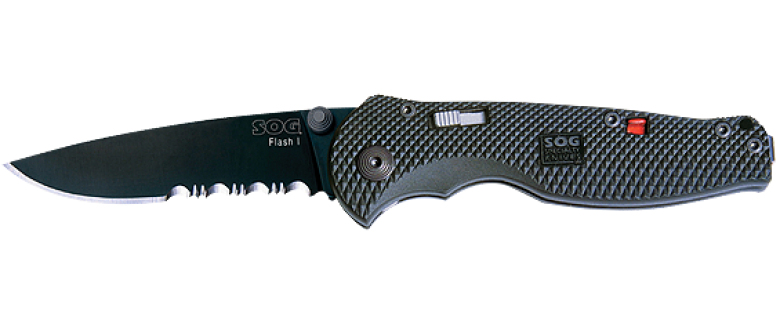 The Flash I (Black TiNi) comes with glass-reinforced nylon (GRN) handle and black TiNi coated 1/2 serrated blade. All Flash knives come standard with SOG's patent pending, reversible bayonet mounted clip that ensures the lowest, most discreet carry possible. We also had the foresight to incorporate an additional safety lock that gives added security when the blade is closed.