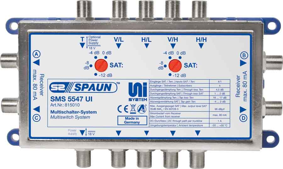 The UniSystem multiswitches can be used as stand-alone device or can be cascaded with themselves for an easy extension of the number of subscribers. The UniSystem is extendable to up to 16 SAT IF levels.