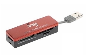Spyker All-in-One USB 2.0 card reader. Interface type: USB 2.0. Data transfer rate: 480 Mbit/s. Colour of product: Red. Compatible operating systems: Windows 2000/XP(32/64-bit)/Vista Windows Server 2003 Mac OS 8.6x Linux OS 2.4.x