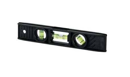Plastic body and three fixed vials 1 Vertical, 1 Horizontal and 1 45° angle Top and bottom edges are parallel and grooved