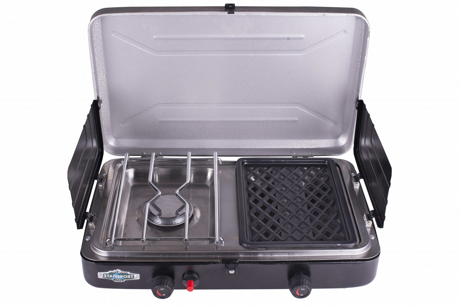 The Stansport Propane Stove and Grill Combo gives you 3 options for outdoor cooking. Cook in a pot or pan on the high-output 12,000 BTU stainless steel burner, or use the 5,000 BTU grill, or use both! No more hauling a grill and a stove on your next outing, Stansports Stove/Grill combo takes care of all your cooking needs with 1 unit!