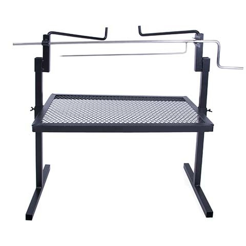 - Stainless steel rotisserie spit (included) turns and