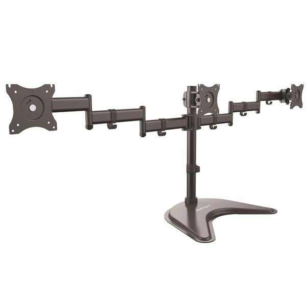 This free-standing triple-monitor stand saves you valuable desk space, while creating a more comfortable and ergonomic workspace. Constructed of high grade steel, the sturdy monitor stand suspends up to three monitors above your desk or other work surface.