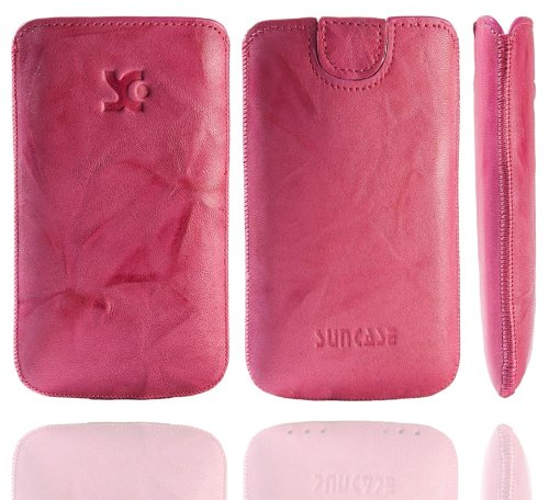 This stylish and eye-catching Suncase pouch is made from high-quality genuine handcrafted leather. The soft internal fabric helps to protect your smartphone from scratches. The sturdy design protects against accidental drops, shocks or any dirt or grease. Pull-release mechanism makes it easy to insert and remove your device from the case.