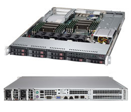 Superserver 1027R-72RFTP, 1U, Dual Socket R (LGA 2011), Intel Xeon E5-2600 (TDP up to 135W, max cache 20MB), Intel C602, 16 x 240-pin DDR3 1600/1333/1066MHz, Matrox G200eW, Intel i350 Gigabit Ethernet + Broadcom BCM57810S 10Gb SFP+, 8 x 2.5" Hot-swap, 6x counter-rotating PWM fans, 700W/750W Redundant 80PLUS Gold