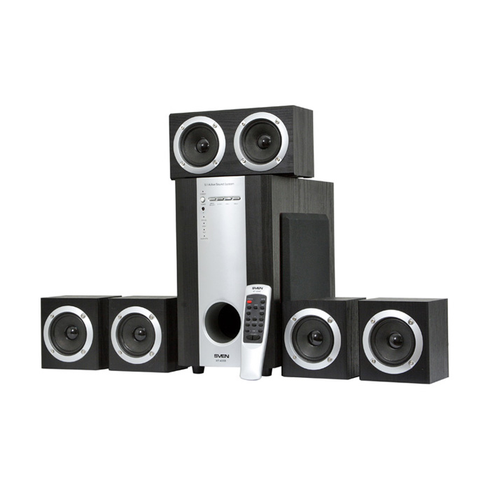 SVEN HT-435D. Audio output channels: 5.1, RMS rated power: 110 W, Recommended usage: Home theatre. Satellite speakers RMS power: 15 W, Satellite speaker mid-range driver size: 7.62 cm (3"). Front speakers RMS power: 15 W, Front speaker mid-range driver size: 7.62 cm (3"). Center speaker RMS power: 15 W, Center speaker mid-range driver size: 7.62 cm (3"). Subwoofer RMS power: 35 W, Subwoofer driver size: 16.5 cm (6.5")