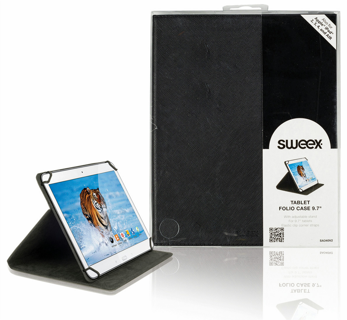 The Sweex Tablet Folio Case 9.7’’ protects your tablet from scratches and dirt and besides can be also used as a stand. This Tablet Case has elastic corner straps for attachment and can be established in a way to make watching videos or typing comfortable. The connections remain accessible, so you can use the tablet without removing it from the case.
