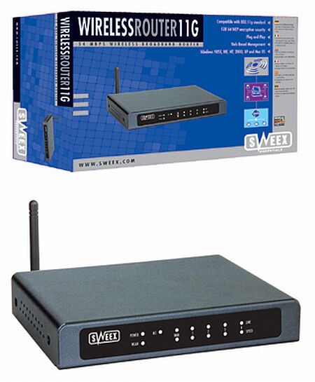 This Sweex wireless broadband router enables you to create a 54 Mbps wireless network for your home or office in no time at all. Share your broadband Internet connection in a flash. This product is a router and access point in one and can therefore also be used as a 4-port switch. Furthermore your wireless network is protected against unauthorised access thanks to the built-in encryption security up to 128 bit WEP encryption. Compatible with IEEE802.11G (54 Mbps) and downwards compatible with IEEE802.11B (11 Mbps).