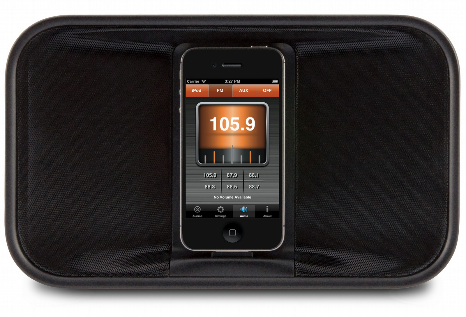 This App-Enhanced Portable Stereo Speaker combines contemporary design with rock-n-roll brawn. Sleek enough to fit on your home bookshelf or office desk, yet compact enough to take with you from room to room, this speaker system provides rich stereo sound. The hidden handle and battery power also make it the perfect portable sound system. Tuck your iPhone or iPod into its protective hinged dock and play your treasured tunes – or use the FM radio and alarm clock app for even greater possibilities!