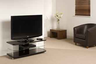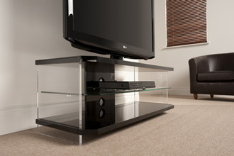 Air is a new approach to the design of A/V furniture to reflect the appearance of the latest slim, light weight screens. The opticly clear side panels givesthe impression that the black shelves are 'floating' while providing a sturdy housing for all your A/V equipment.