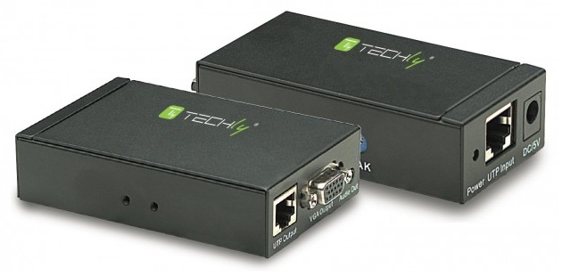 Techly Amplifier Extender VGA and Audio over Network Cable IDATA EX-DL344. Video port type: VGA, Cable types supported: Cat5, Cat5e, Cat6. Supported graphics resolutions: 1280 x 960, 1600 x 900, 1024 x 768 (XGA), 1280 x 1024 (SXGA), 1280 x 720 (HD 720), 1600 x 1200 (UXGA, Maximum resolution: 1920 x 1200 pixels. Colour of product: Black. Weight: 784 g