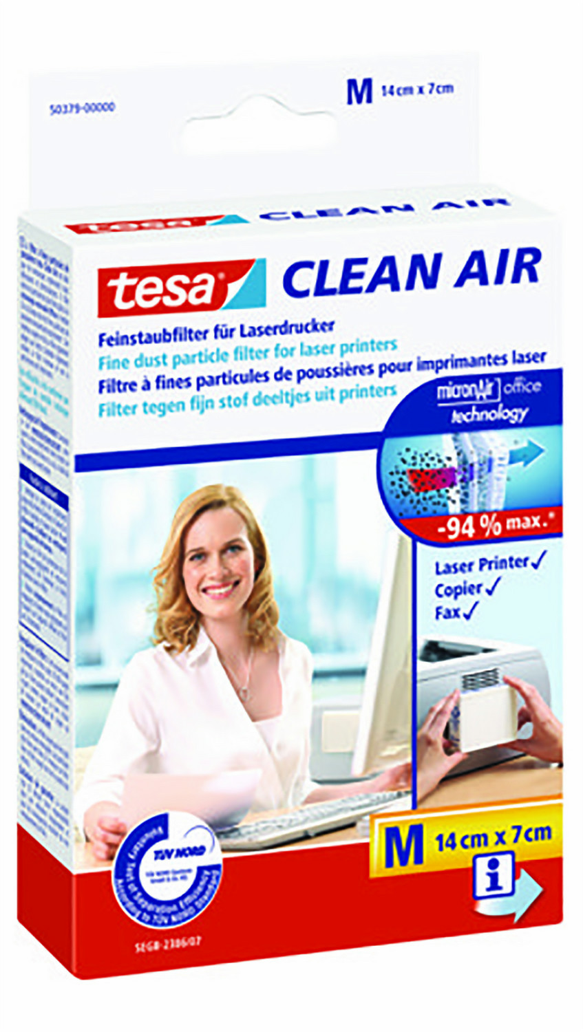 The tesa Clean Air® fine dust filter for laser printers, fax machines and photocopiers ensures clean air in the office. It uses micronAir® Office technology to constantly filter even the smallest particles: you can be sure that the air in the office is free to a large extent from any fine dust particles produced by laser printers.