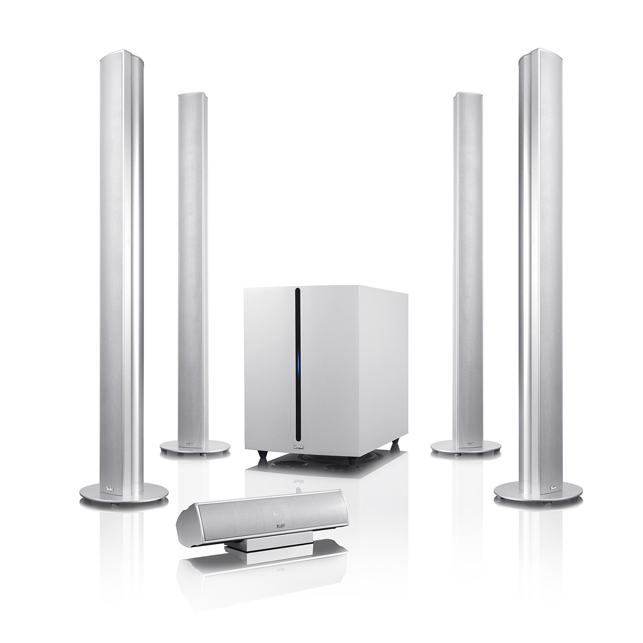 - Home cinema speaker set with slender aluminium columns