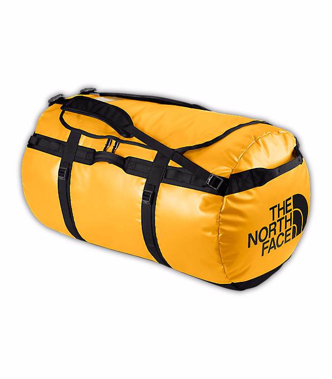 Extra Small, 33L, Nylon, Summit Gold / TNF Black It's not your average duffel bag. Made from a durable laminate material, the Base Camp Duffel is a bomber of a bag. Amply resilient to be roughed around in-flight, or to be transported up a mountain via a yak, this is one burly duffel bag. 33-liter volume provides ideal storage for overnighters or day trips. New features include redesigned straps and a small side-zip pocket that fits keys or your passport.