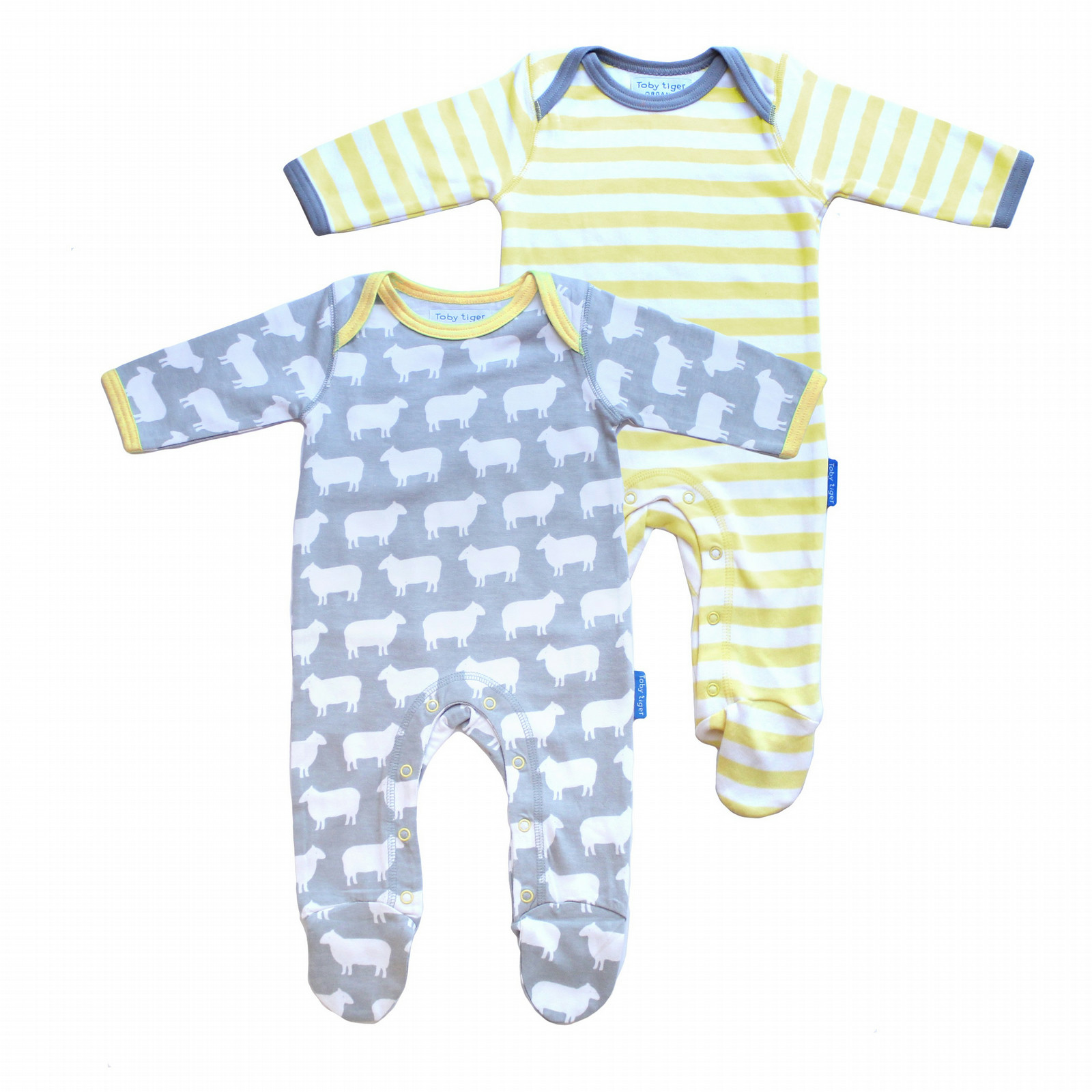 Our Toby Tiger gorgeous printed sleepsuits are bold, fun and super soft. One sleepsuit has bold stripes and the other is patterned. They are kind to your little ones skin and good for the planet too. The envelope neckline and poppers on the inside leg makes changing easy.