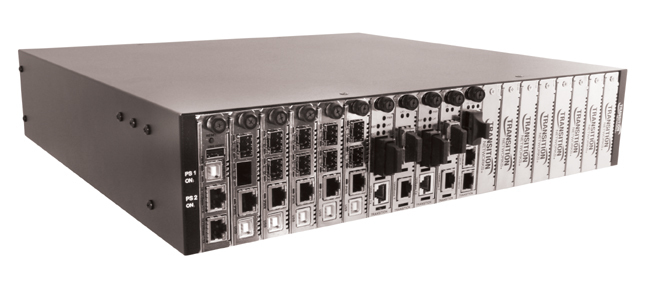 The ION219-x is an all new intelligent, high-density, multi-protocol system supporting a variety of network interface devices . Designed for both carrier class and enterprise network applications where multiple points of fiber integration and secure network management of the fiber interface devices is essential. An end-to-end fiber integration solution can be achieve by pairing the modules in a high density ION chassis with the modules in another ION chassis, an ION stand-alone, or a Transition Networks’ Point System™ stand-alone device. To take full advantage of all the features and functions available with the ION Chassis, an ION Management Module is required. The ION Management Module connects to the chassis backplane and communicates with the individual cards in the ION Chassis. Each slide-in-module for the ION Chassis has specific features and functions that are controlled via the ION Management Module. A network administrator can configure, monitor and troubleshoot ION slide-in-modules remotely via the ION Management Module.