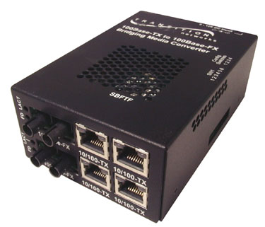 The SBFTF101-140 6-port Ethernet/Fast Ethernet bridging media converter allows connection of 10Base-T Ethernet and/or 100Base-TX Fast Ethernet twisted-pair copper network devices to network devices on a 100Base-FX Fast Ethernet fiber network.
