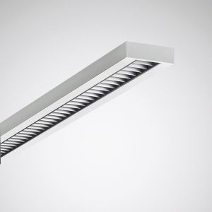 With finely segmented parabolic specular louvre, semi-specular. VDU-compliant according to EN 12464-1. Louvre mounting and self-actuating electrical earthing via sliding contact catches. Louvre can be hinged downwards and unhooked on both sides without tools.