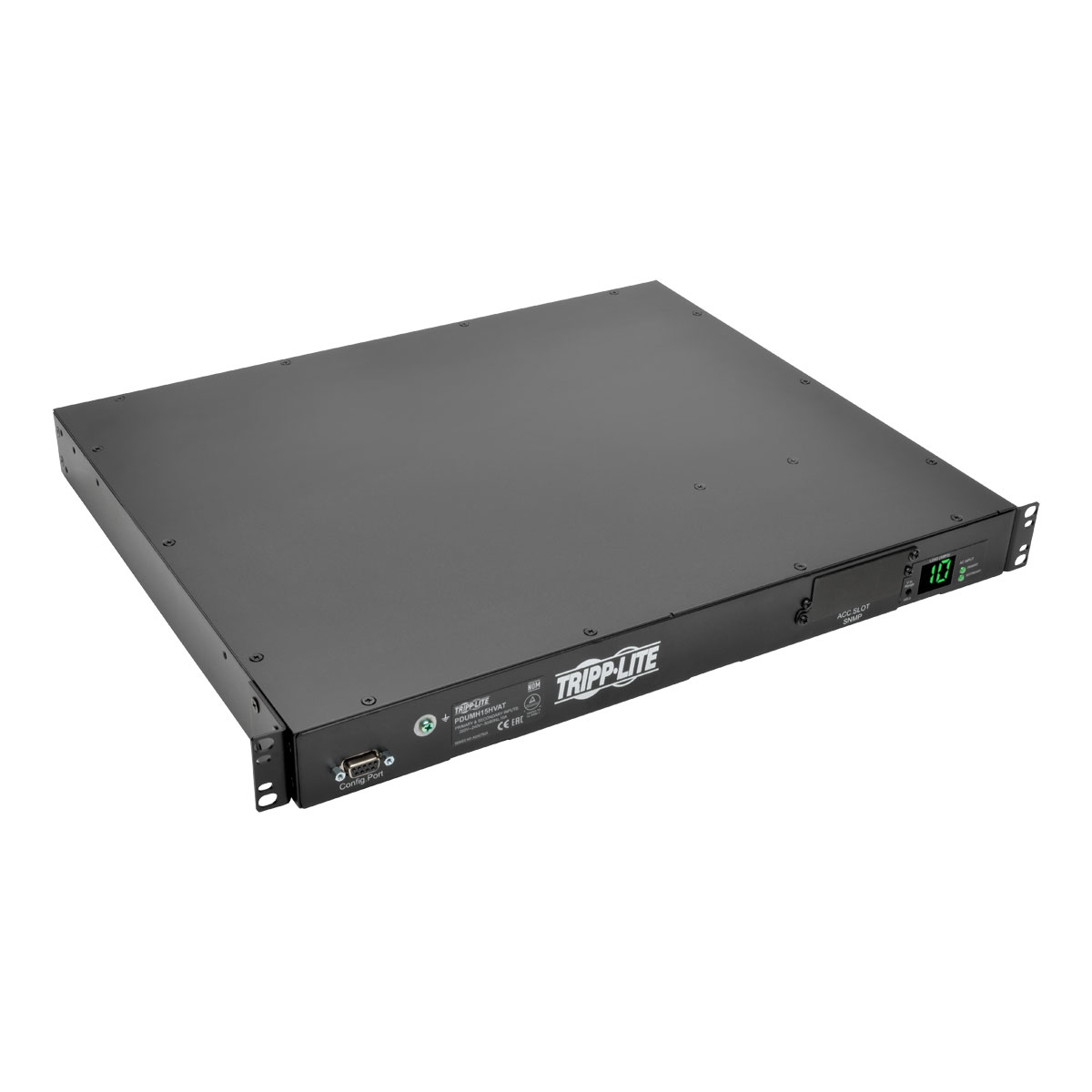 The PDUMH15HVAT 2–2.4kW Single-Phase 200–240V ATS/Metered PDU enables redundant power for network devices with non-redundant power supply configurations. Ideal for data centers and server rooms, it mounts in 1U of space in EIA-standard 19-inch racks and features 10 C13 outlets. Dual 3.6-meter input cords with IEC-320 C14 plugs connect to separate primary and secondary single-phase power sources in a nominal voltage range from 200–240V. Plug lock inserts prevent cords from accidental disconnection. The PDUMH15HVAT constantly evaluates the power quality of both input sources. Dynamic solid-state (TRIAC) automatic transfer switching allows the PDU to switch to the secondary source within 2–5 milliseconds should the primary source fail or become unstable to ensure your connected equipment operates without interruption. Built-in slot supports the optional SNMPWEBCARD and WEBCARDLX (sold separately), which turn the PDUMH15HVAT into a switched PDU by allowing remote access to the PDU for power monitoring, configuration, outlet control and notifications via web browser, SSH, telnet or SNMP. Digital ammeter monitors total output current. LEDs display outlet on/off status and input power status on primary and secondary inputs.