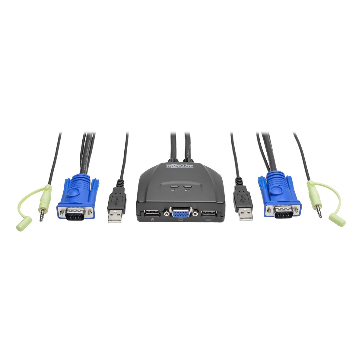The compact B032-VUA2 2-Port USB/VGA Cable KVM Switch with audio and remote switch lets you access, boot, reboot and control two desktop or laptop computers using one VGA monitor, USB keyboard and USB mouse. VGA, USB and audio cables are built into the unit.
