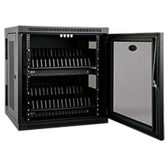 The charging station is easy to configure. It ships fully assembled and supports mounting to a wall, desk, table, counter or floor. The front door opens 180 degrees for clear access, and removable dividers accommodate thicker devices. You can also convert the charging station to a mobile cart with Tripp Lite’s CSHANDLEKIT accessory.