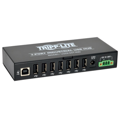 Tripp Lite's U223-007-IND is a rugged, all metal constructed USB 7-Port hub for use in data centers, work areas, and Industrial applications. Can be mounted on a wall or din-rail with included mounting hardware. Supports Hi-Speed USB 2.0 transfer rates at 480mbps, but is also backward compatible to USB 1.1 ( 12mbps ). Hub is bus-powered through the computer connection, or can self power with an external adapter ( not included ) or via the included 3-wire terminal block connector ( 9-36V ).