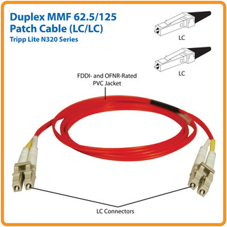 Tripp Lite's Red, 3-meter multimode duplex micron fiber optic LC/LC patch cable is manufactured from 62.5/125 zipcord fiber. The cable has LC connectors on each end, a PVC jacket, and is FDDI and OFNR rated. Duplex multimode fiber is most commonly used in LAN applications. Ideal for color coding the cable plant.