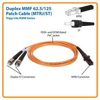 Tripp Lite's 0.91 m (3-ft.) multimode duplex fiber optic MTRJ/ST patch cable is manufactured from 62.5/125 zipcord fiber. The cable has MTRJ to ST connectors, a PVC jacket and is FDDI and OFNR rated. Duplex multimode fiber is most commonly used in LAN applications.