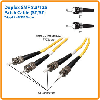 Tripp Lite's 3-Metre (10ft), singlemode duplex fiber optic ST/ST patch cable is manufactured from 8.3/125 zipcord fiber. The cable has ST connectors on each end, a PVC jacket and is FDDI and OFNR rated. Duplex singlemode fiber is most commonly used in LAN applications.