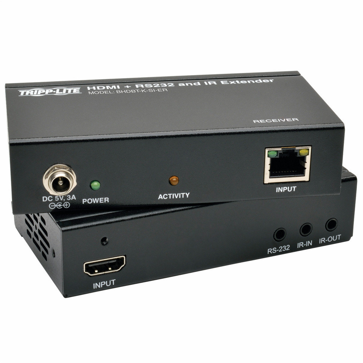 The BHDBT-K-SI-ER HDBaseT Extender Kit allows you to transmit HDMI audio and video, RS-232 serial and IR Remote Control signals up to 152.4 m (500-ft.) over a single Cat5e/6/6a cable, including a 1920 x 1080 (1080p) signal @ 60 Hz. Add up to five Tripp Lite BHDBT-TR-SI-ER transceivers (sold separately) between the transmitter and receiver units to further expand the range up to 3,000 feet (900 m) with a monitor connected via HDMI port to each transceiver. You can also control RS-232 serial devices, such as touchscreen displays or scanners, at baud rates up to 115 Kbps. The BHDBT-K-SI-ER’s 2-way IR Remote Control feature (@ 39 KHz) lets you control your Blu-ray player using its remote when at the remote monitor or control your remote monitor using its remote when at the Blu-ray player. Locking HDMI ports (ideal for use with Tripp Lite’s High-Speed HDMI cables with locking connectors, such as P569-006-LOCK) on both the transmitter and receiver prevent cables from coming loose or undone, ensuring an intact signal. The BHDBT-K-SI-ER supports 7.1-channel surround sound, DTS-HD and Dolby TrueHD audio, as well as 3D video, EDID and HDCP. Included mounting hardware lets you attach each unit to a wall, rack or pole. There’s no software to download or install, and you can have the BHDBT-K-SI-ER Extender Kit set up and ready to go quickly.
