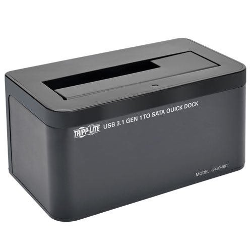 The U439-001 USB 3.1 Gen 1 to SATA Hard Drive Quick Dock allows you to quickly and easily add storage and transfer data to your computer, tablet, Ultrabook, Chromebook or laptop from a SATA hard drive. Just connect a 2.5-inch or 3.5-inch SATA HDD (Hard Disk Drive) or SSD (Solid State Drive) to the dock’s top port, connect the USB-C port to the USB-C port on your device using the included 3-foot cable, connect the external power supply to the dock and an AC power source, and turn on the rear on/off switch. A blue LED will indicate a solid connection with your device. The dock accepts SATA III (6 Gbps), SATA II (3 Gbps) and SATA I (1.5 Gbps) drives, including 2.5-inch and 3.5-inch SATA HDDs and SSDs of all capacities (tested up to 6 TB). It supports USB 3.1 Gen 1 data transfer rates up to 5 Gbps, and is backward compatible with previous USB generations. Works right out of the package with no software or drivers required. Compatible with all major operating systems that comply with USB standards. USB Type-C and USB-C are trademarks of USB Implementers Forum