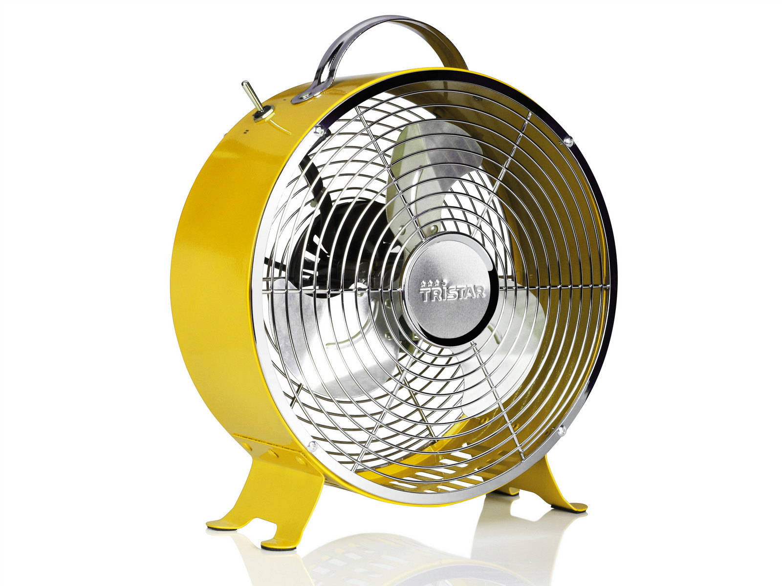 1385 rpm, 25 cm, 2 Adjustable settings, Yellow Trendy, retro fan. This fan has 2 adjustable settings for your refreshment in the summer. With his practical size, a diameter of 25 cm., you can use this fan in several spaces of your home.
