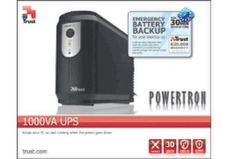 Compact, reliable 1000VA battery back-up UPS with 2 surge protected power outlets. Keeps your PC up and running when the power goes down; to let you save important data and avoid damaged hardware. 20.000 Euro warranty on connected equipment (check conditions on trust.com). 2 battery protected outputs for a back-up time up to 10 minutes (depending on load). Surge protected outputs to protect connected devices against damage from power surges and spikes. 2 additional RJ-11 connections to protect telephone, fax or modem. Clear optical and acoustic indicators for power source and low battery. Overload and short circuit protection.