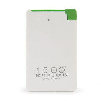 Ultra-slim power bank, 1500 mAh capacity, with integrated Micro USB recharging cable and Micro USB charging socket. Recharges smartphones and other compatible devices such as MP3 players, digital cameras etc. High-efficiency lithium polymer battery.