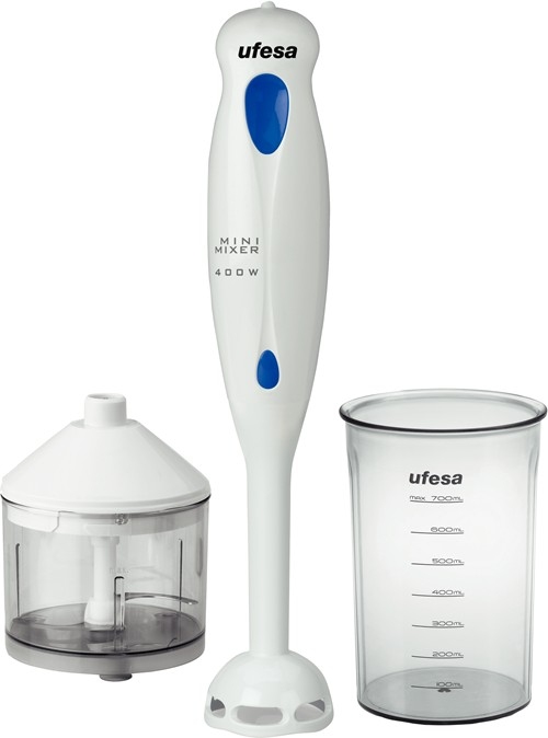 Ufesa BP4542 Mini Mixer 400. Colour of product: Blue, White, Cord length: 1.5 m. Power: 400 W, AC input voltage: 220 - 240 V, AC input frequency: 50/60 Hz. Dimensions (WxDxH): 65 x 65 x 357 mm