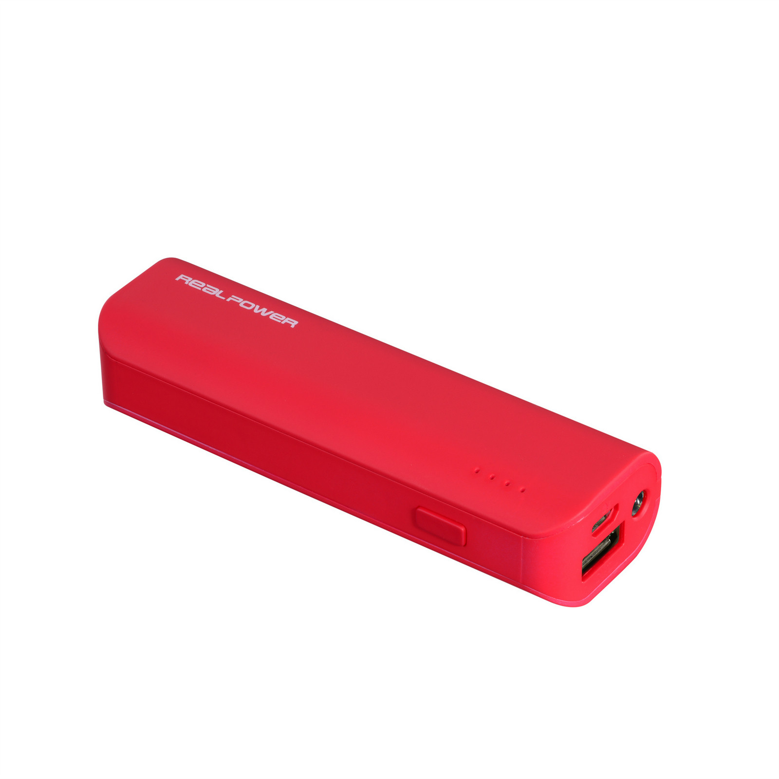 RealPower PB-2600, 2600 mAh lithium-ion, 5V/1000mA The RealPower PB-2600 charges your smartphone on the go. The powerbank offers an integrated rechargable battery with 2600 mAh, which does not only charge your smartphone, but also other mobile devices like MP3-players or digital cameras. The scope of delivery includes a Micro-USB cable. LED lights inform you about the powerbanks current status. It also offers a protection to avoid excessive charging or discharging. The robust and classy rubber coating case is available in five different colours.