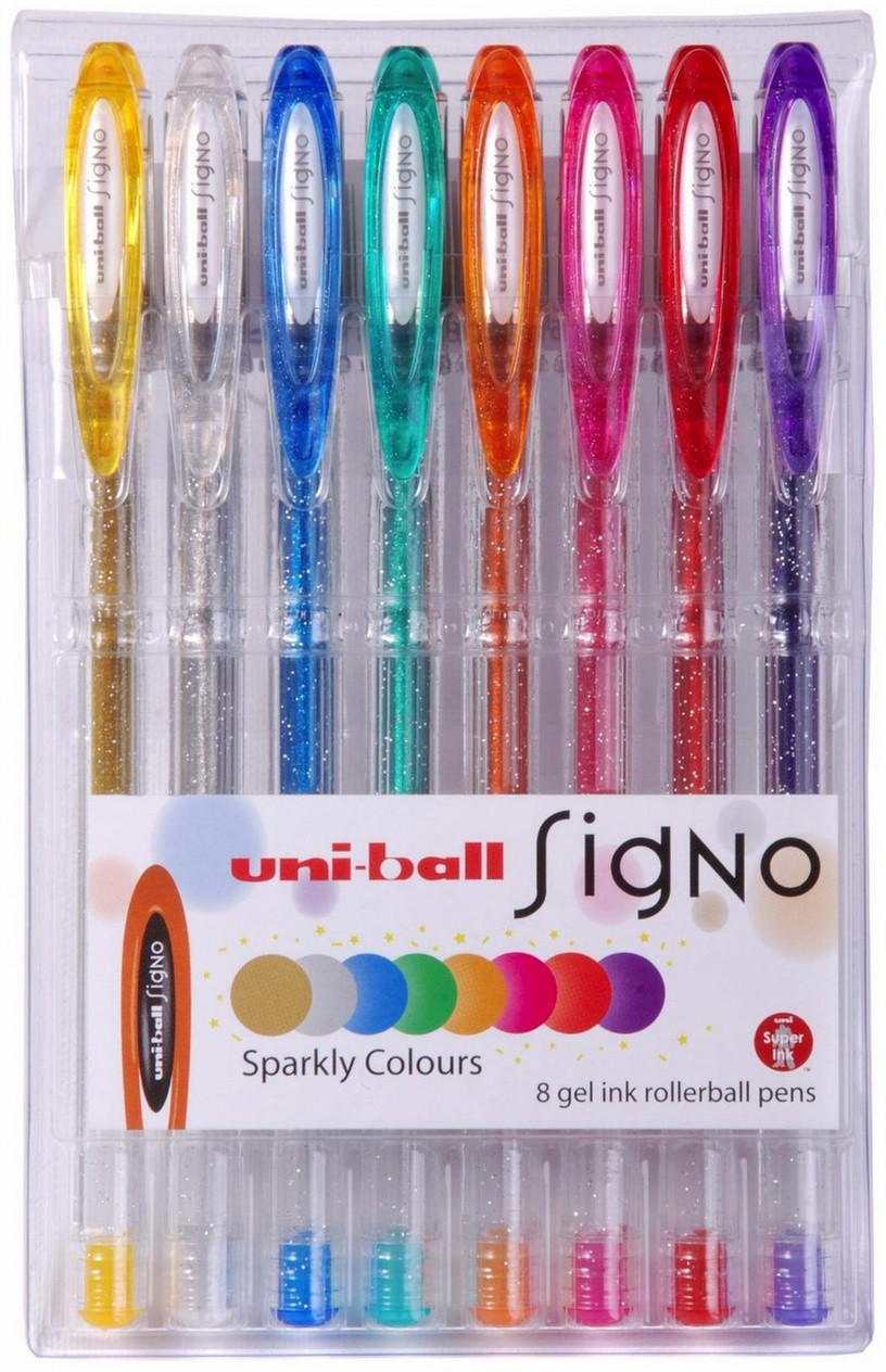UM-120 Signo Sparkling 8 Piece Wallet - This super smooth and quick drying rollerball is a market leader and all-round favourite. So much so that smooth ink, colour variety and long-lasting performance have become synonymous with the Signo brand. This pack contains 8 sparkling colours - Gold, Silver, Blue, Red, Orange, Green, Violet, Pink.