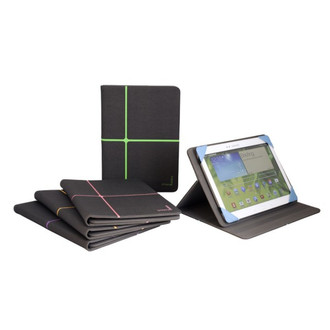 Universal folio 10'' for tablets. Modern design, anthracite grey with a colorful touch. The fixing system inside the folio is user-friendly and nicely designed with the 4 small colored angles which remind of the outside color. Stand function with multiple viewing angles. All connections remain available.