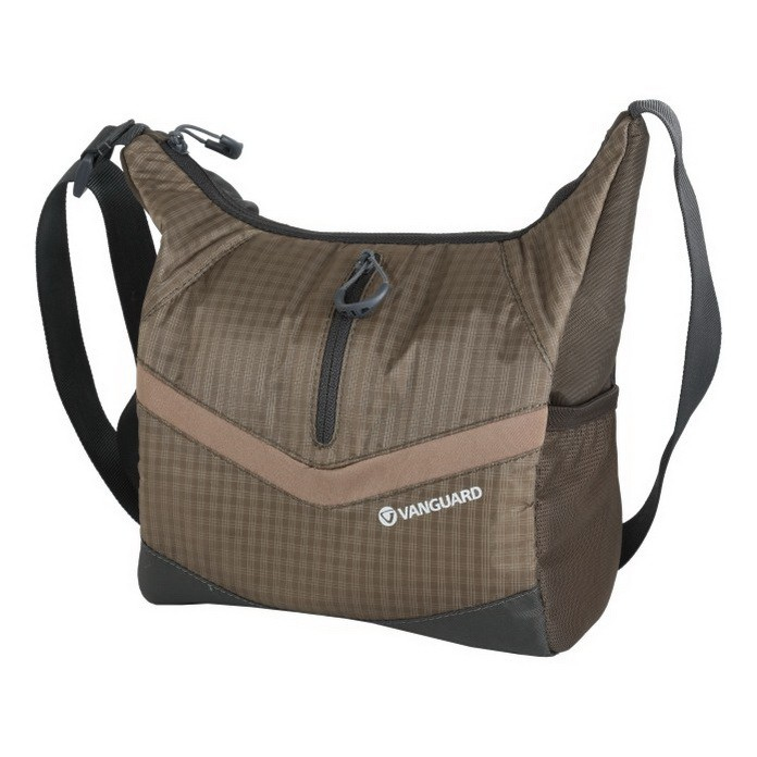 Providing an easy-access top opening, this tri-colored khaki green Reno 22 Shoulder Bag from Vanguard holds a DSLR with an attached lens, an extra small lens and a flash, or a mirrorless camera with a few lenses around a padded touch-fastened divider within the padded interior. For extra security, the bag is designed to look like it's not holding your camera gear. Your gear could also be removed to use the bag for everyday travel. There is a front accessory pocket that fits a lens cap or another small accessory, and dual side mesh slip pockets that fit a water bottle or other similar items. To carry the bag there is an adjustable shoulder strap, and a removable rain cover is included for unpredictable weather.