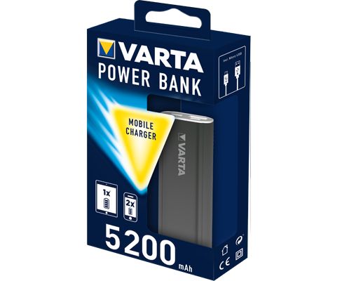 Varta Power bank 5200. Colour of product: Grey, Charger compatibility: Digital camera, Gaming controls, MP3, Portable gaming console, Smartphone, Tablet. Cable length: 0.5 m. Battery technology: Lithium-Ion (Li-Ion), Battery capacity: 5200 mAh, Charging source: AC, USB. Width: 40 mm, Depth: 21 mm, Height: 100 mm. Cables included: Micro-USB