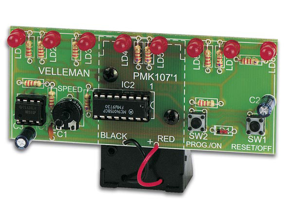 LED Running Light 8 LEDs. Different LED running effects are selectable (PROG push button). Adjustable effect speed (SPEED potentiometer). Push button for power stand-by (OFF push button).
