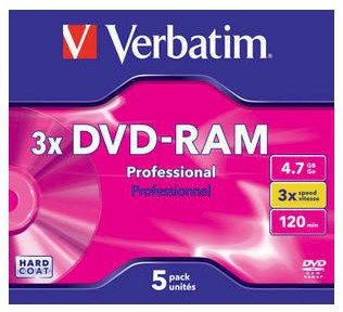 DVD-RAM is a rewritable disc providing 4.7GB capacity (9.4GB for Double Sided). Compliant with the DVD-Forum specifications. DVD-RAM is designed for data intensive, high performance applications. Data storage on DVD-RAM can be accessed in the same manner as a hard drive, with drag and drop capabilities, and can be overwritten 100,000 times.