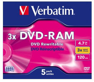 DVD-RAM is a rewritable disc providing 4.7GB capacity (9.4GB for Double Sided). Compliant with the DVD-Forum specifications. DVD-RAM is designed for data intensive, high performance applications. Data storage on DVD-RAM can be accessed in the same manner as a hard drive, with drag and drop capabilities, and can be overwritten 100,000 times.