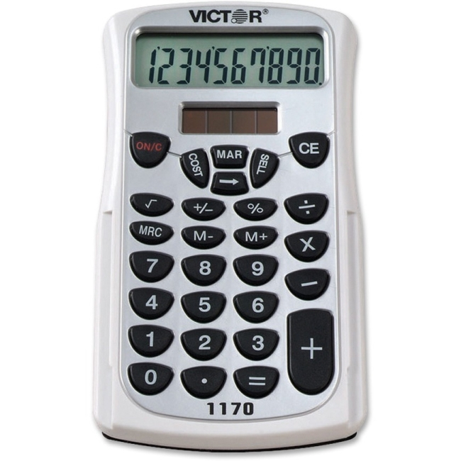 10 digit handheld business calculator is ideal for in the office or on the go. Features a large, easy-to-read LCD display. This calculator has a stylish contemporary design and feature-loaded functionality. Cost/sell/margin keys make for quick and easy profit calculations (enter two variables and the third automatically appears). Other functions include: backspace key, 3 key independent memory, percent key, square root key, change sign key and automatic constants. Includes a slide-on protective hard shell case.