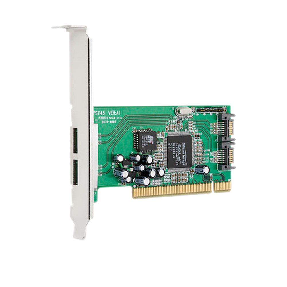 The PCI version 2.3 cards feature internal and external SATA ports to accomodate new high speed drives. Both cards have dual slots with the PS5120 having both external data as well as power slots.