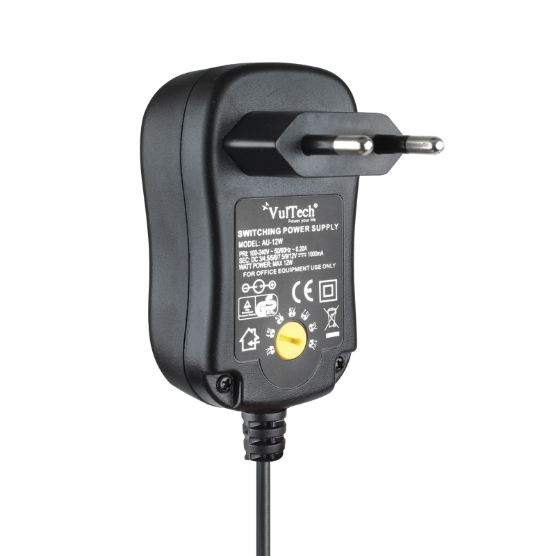 Vultech AU-12W. Output power: 12 W, Efficiency: 85%, Output voltage note: 3V; 4.5V; 5V; 6V; 7.5V; 9V; 12V. Power supply type: Indoor, Purpose: Universal, Power protection features: Overload, Short circuit, Under voltage. Colour of product: Black, LED indicators: Charging