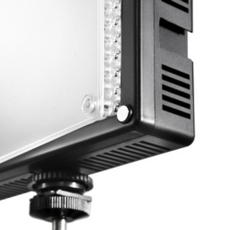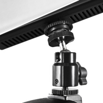 A diffuser panel is included in delivery which ensures a softer light characteristic and therefore is ideal for the portrait and reportage fields. The diffuser panel is simply attached with magnets, which allows a quick attachment and detachment. As no elements are being worn down this way, the lifetime of the LED light and diffuser panel is considerably increased. The LED is mounted via a stationary accessory shoe with 1/4 inch thread. Additionally, a ball head with accessory shoe is available to you, which allows you to tilt the LED light and therefore determine the light direction even more precisely.