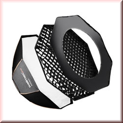 For precisely directing the light, a grid with a depth of 3cm can be fastened to the Velcro running around the edges of the softbox. Also included is a gold/silver layer which you can use to change the color tone.