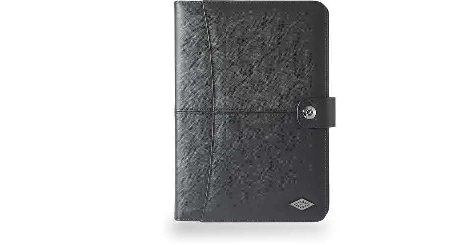 High-quality tablet organizer in modern design made of structured, hard-wearing artificial leather with an A4 outer pocket and a comfortable magnetic closure with retractable strap. The flexible holder with each two firm and flexible holding brackets adapts to most tablet models independent of brand. The flexible holder mechanism fits to all tablets with a length of 24.0 - 26.6 cm and a width of 17.0 - 18.6 cm. The tablet holder features two cut-outs for photo lenses and is removable by a zipper. Includes: foldable presentation stand for transversal and high format, A5 pocket for documents, 2 card compartments and 1 pen holding loop, A5 writing pad.